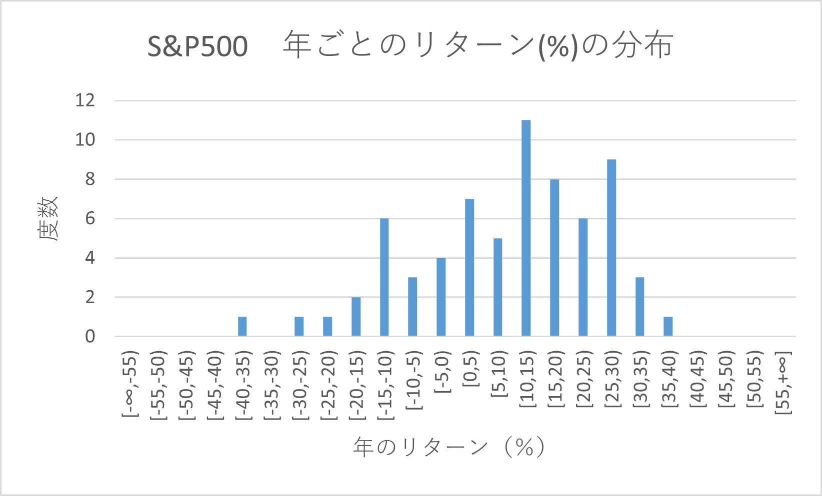 横軸の数字を [0,5) のような書き方をしていますが、これは 0≦リターン(%)<5 だった年が 7 回あった、という意味です。