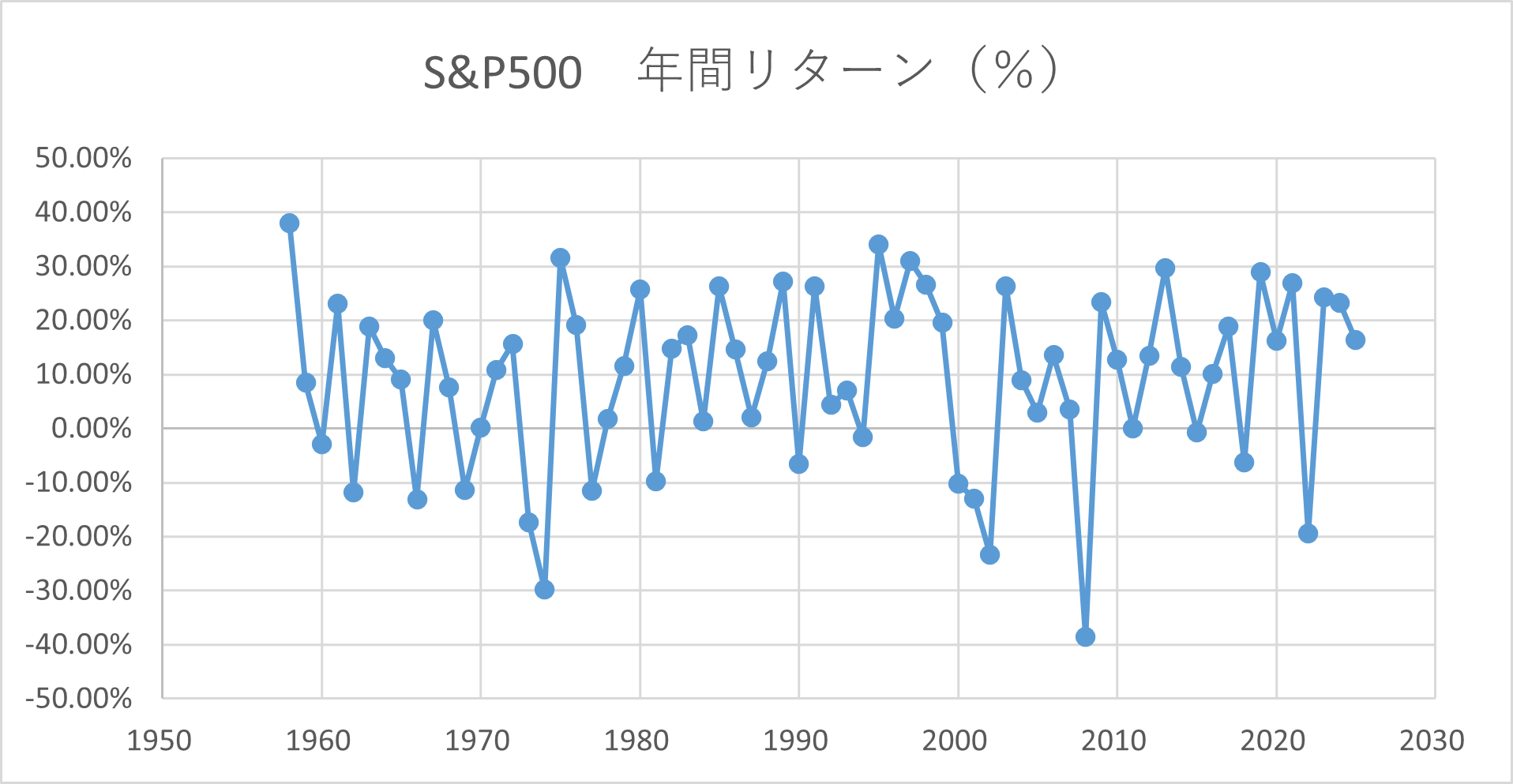 最新データである2025年終値までを反映し、S&P500の過去68年間の年率リターンを分析しました。